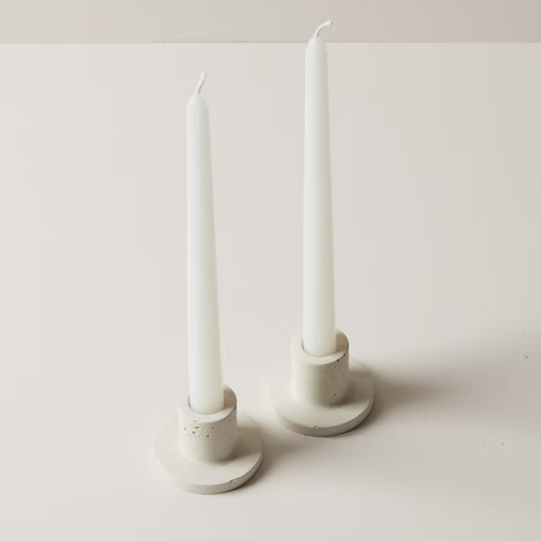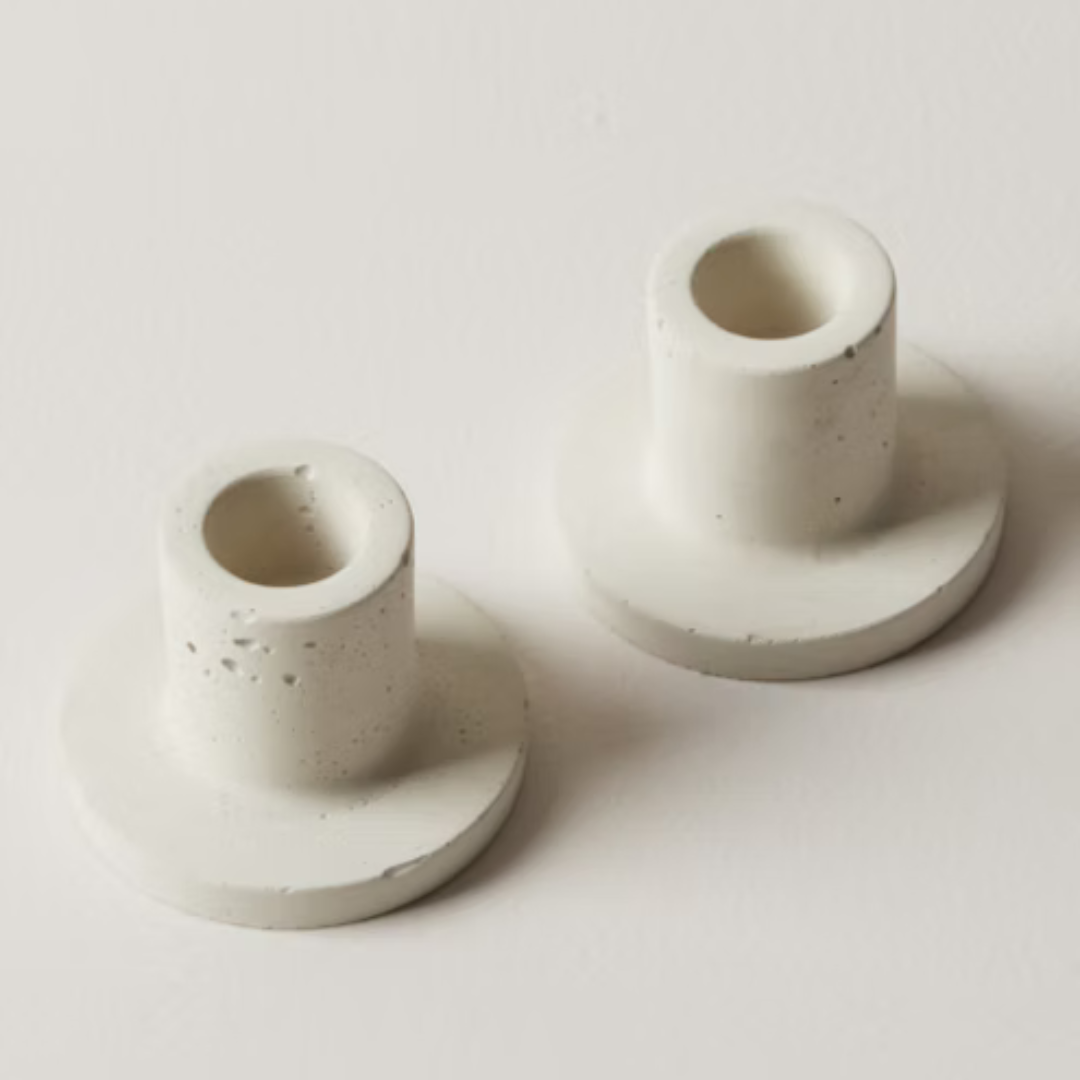 זוג פמוטים נמוכים ומעוצבים, המיוצרים בעבודת יד מבטון בגוון בז' ייחודי שנוצר במיוחד עבור הקולקציה שלנו.